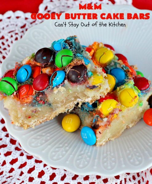M&M Gooey Butter Cake Bars are so luscious you will have a hard time sharing them with others!