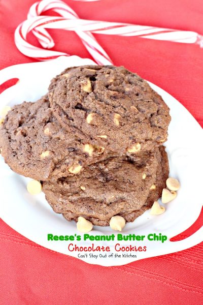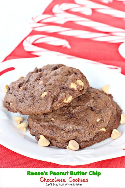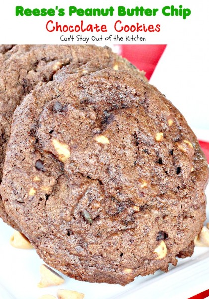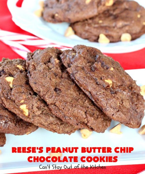 These are lovely chocolate cookies. Plus they supply a needed dose of peanut butter as well. Consider making up a batch of Reese’s Peanut Butter Chip Chocolate Cookies for your holiday party or Christmas Cookie Exchange. The combination of flavors is incredible and everyone always loves them.