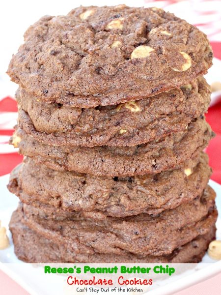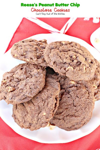 Reese’s Peanut Butter Chip Chocolate Cookies are awesome. If you love chocolate and peanut butter together this cookie is the best of both worlds. It has rich chocolate flavor. Peanut butter chips are added providing a burst of flavor that’s amazing. They make exceptionally good Christmas cookies, too. Almost everyone we’ve ever given these cookies to for our Christmas Cookie Extravaganza over the years has loved these cookies. The outsides are crispy but the insides are soft and chewy.