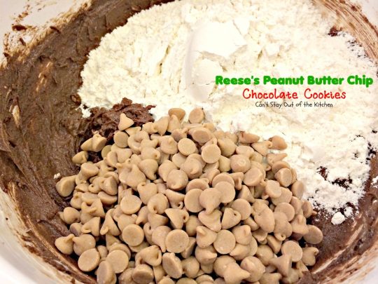 - Stir in UNBLEACHED all-purpose flour and either peanut butter chips or Reese’s mini pieces peanut butter candies.