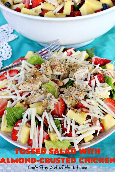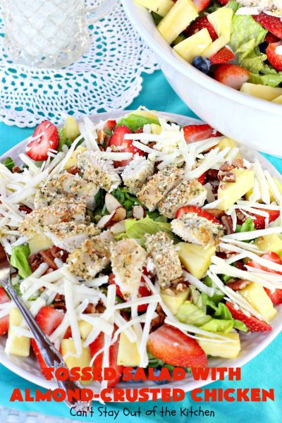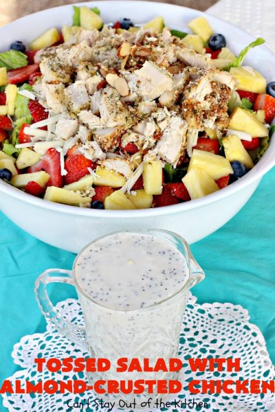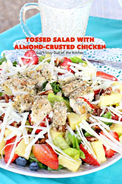 Tossed Salad with Almond-Crusted Chicken is one marvelous salad recipe. It’s a fruity, tossed salad with strawberries, pineapples and blueberries. Then I added Romano cheese, toasted pecans and Almond-Crusted Chicken. It’s served with my delicious Healthy Lemon Poppy Seed Dressing. Like I said before, this is a spectacular salad. It’s especially nice as a main dish salad.