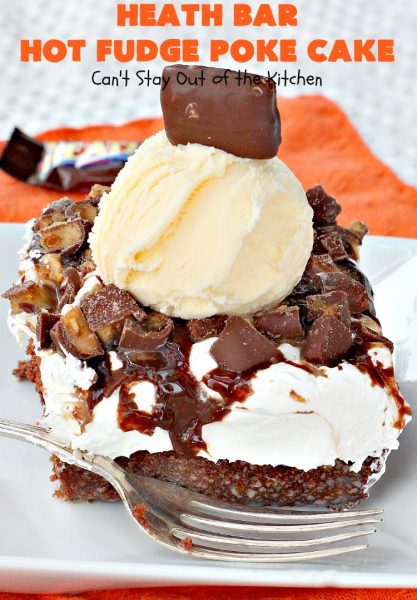 Heath Bar Hot Fudge Poke Cake is one of those desserts you just have to make. Oh my goodness, this cake is divine! It’s a rich chocolaty cake that’s poked with a straw, then both condensed milk and hot fudge sauce is poured over top. The cake is topped with Cool Whip, more hot fudge sauce and chopped Heath Bars. Need I say more? Heath Bar Hot Fudge Poke Cake is spectacular by itself, but serving it ala mode makes it even more phenomenal!