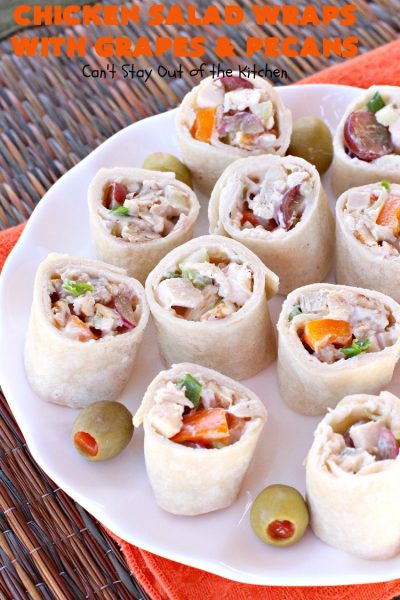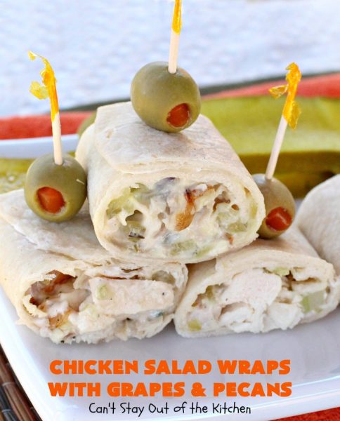 Chicken Salad Wraps with Grapes and Pecans is great served as an appetizer for tailgating parties, or for lunch and dinner menus.
