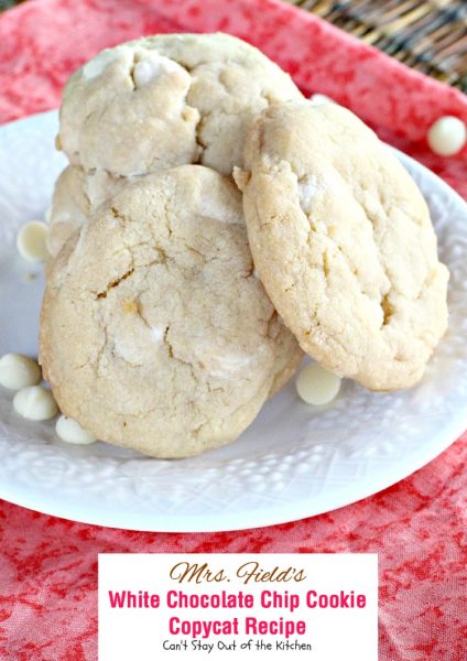 Mrs. Field’s White Chocolate Chip Cookie Copycat Recipe is inspired from my Mrs. Field’s Chocolate Chip Cookie Copycat Recipe . I published that one in September of 2013. I used that same basic copycat recipe from Todd Wilbur. This time I made no attempt to try to bake these cookies in 9 minutes like his original recipe indicates.
