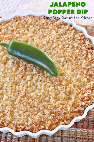 Jalapeno Popper Dip is the real deal. This dip is to die for, especially if you enjoy Tex-Mex spiciness. Jalapeno Popper Dip uses both diced green chiles and jalapenos, along with cream cheese, and both Mexican and Italian blends of cheeses so it’s filled with cheese. On top of that it’s got buttered Panko bread crumbs on top. I love ordering Stuffed Jalapenos at restaurants as an appetizer, and Jalapeno Popper Dip is the next best thing with spicy peppers and lots of cheese!