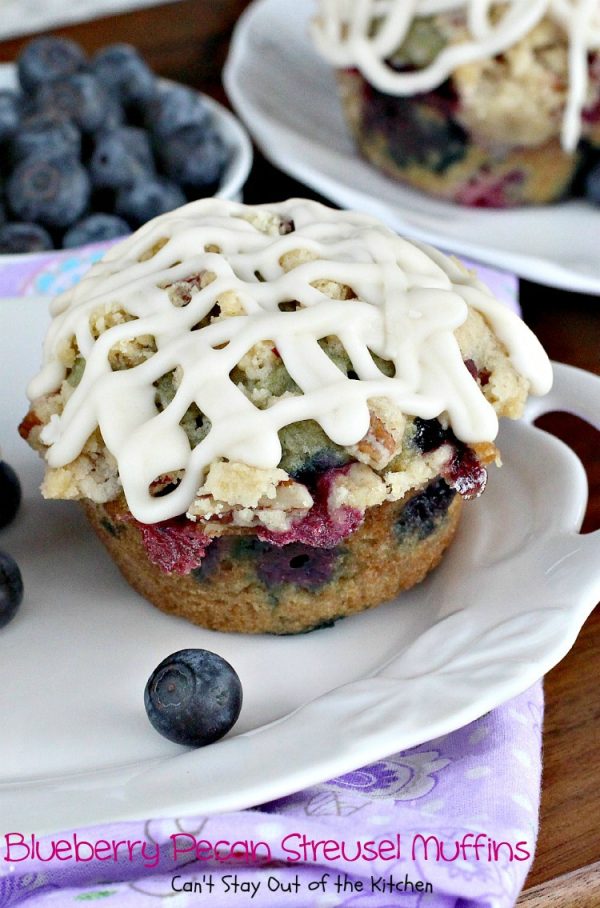 Are you ready to taste one of the most scrumptious, delectable muffins ever? Blueberry Pecan Streusel Muffins fall into that category. No kidding. These muffins are the real deal. Yes, of course, they’re filled with blueberries but they have SO much more. These also are made with blueberry Greek yogurt providing a very moist muffin rather than one that’s dried out.