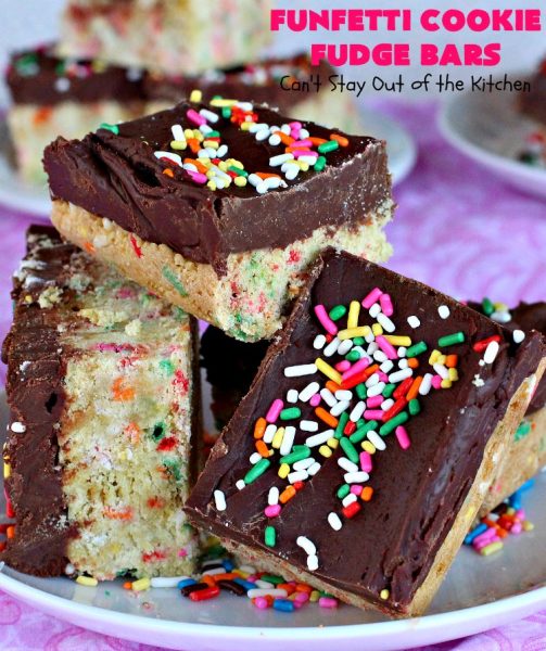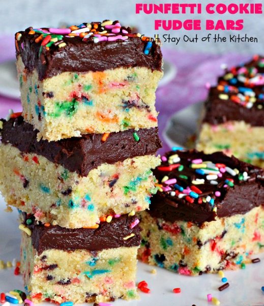 Funfetti Cookie Fudge Bars are so much fun. I’m a funfetti and sprinkles girl. Really. I love bling on clothes and shoes and I certainly love it on food as well. 🙂 So anytime it’s in cakes, pies, cookies, pancakes or other desserts I’m all for it. Funfetti Cookie Fudge Bars have plenty of funfetti sprinkles in the brownie part and then they’re sprinkled on top of the fudgy frosting as well. Drool. Sigh. So I’m all for ’em!
