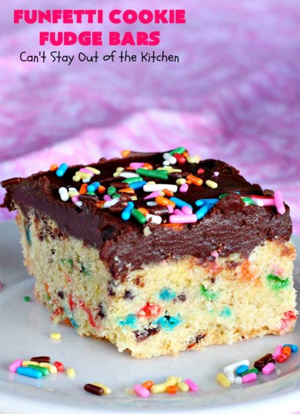 I made some goodies last month to take to my dentist’s office and my hair stylist, as well as giving some to John to take to friends. The cookie portion is half brownie-like and half cake-like in texture. The simple, fudgy frosting is so mouthwatering it makes this lovely cookie-bar incredibly special. If you’re a funfetti lover like I am, you too, will love these bars and find it difficult not licking all the icing off the sides of the baking dish after you remove them from the pan.