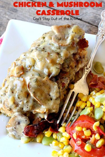 If you’re looking for a different way to make chicken, then give Chicken and Mushroom Casserole a try. I guarantee you won’t be disappointed with this fantastic version. It’s also a terrific entree to serve for company or holiday dinners, like Mother’s Day or Father’s Day. Plan to lick your lips and salivate after every bite. 🙂