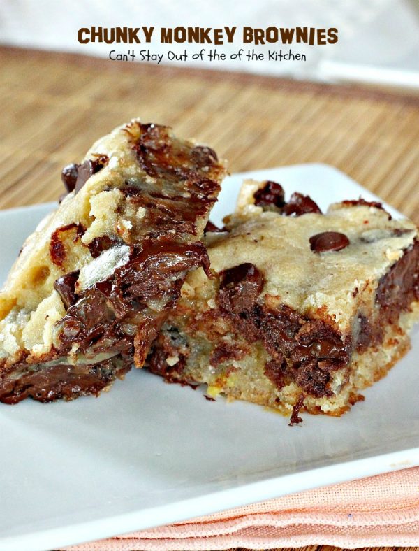 Chunky Monkey Brownies are so sensational you will drool while you’re eating them. No kidding. I know you are probably tired of me raving about the richness and decadence of a specific dessert. I just can’t help it. Instead of using regular chocolate chips I used Hershey’s new baking melts in the brownie and then used chocolate chips on top. Oh, my. Chocolate just explodes in your mouth with every bite. The Baking Melts are much larger than chocolate chips so it’s like having miniature chocolate candies inside. Loved ’em! 🙂