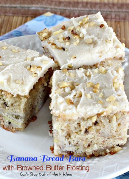 These lovely dessert bars are topped with a fantastic Browned Butter Frosting that’s absolutely heavenly. Great way to use up overripe bananas too.