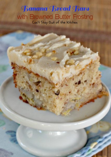 Banana Bread Bars with Browned Butter Frosting | Can't Stay Out of the Kitchen | these delicious #brownies are great for summer #holiday fun. The browned butter frosting is amazing. #bananas #dessert #cookie