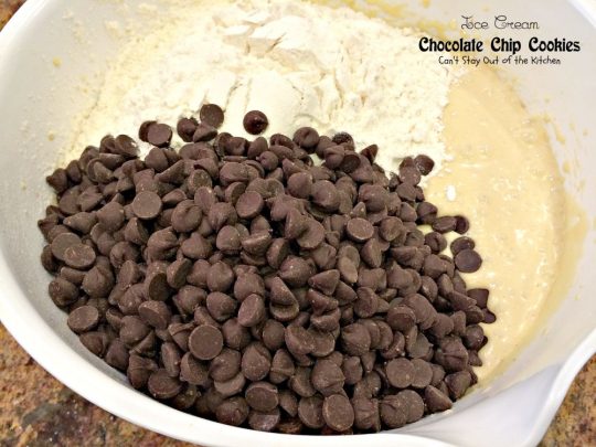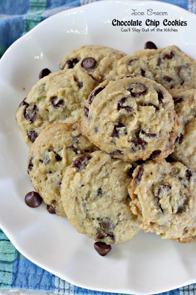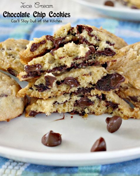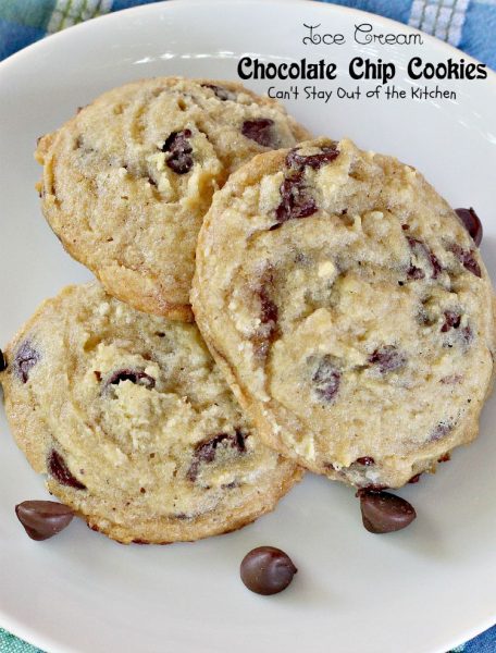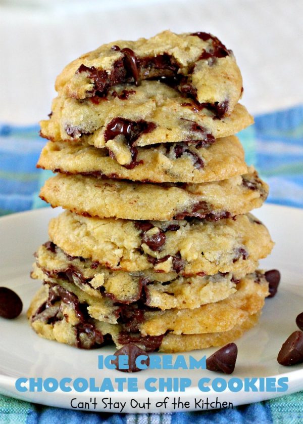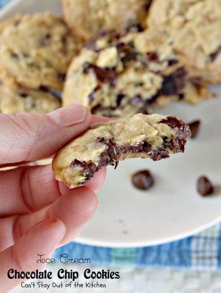 Ice Cream Chocolate Chip Cookies are special. If you’re looking for a fabulous cookie to make anytime you need a chocolate (or ice cream) fix, this is the cookie for you! But be prepared to have to make another batch right away. After all, everyone will want 3 or 4 or 5 or…. more of these lovely cookies.