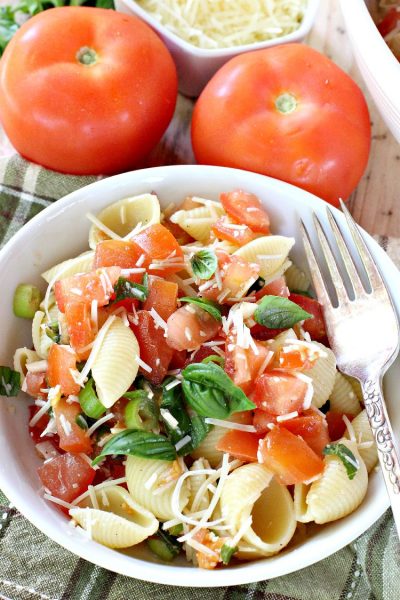 Bruschetta Pasta Salad is one of the most delicious pasta salad recipes I’ve eaten.I have to admit to loving pasta salads. Tomatoes, fresh basil from our garden, onions, garlic, olive oil, balsamic vinegar and sea shell pasta provide such a tasty combination of flavors. I’m sure you’ll enjoy this salad down to the last bite. šŸ™‚