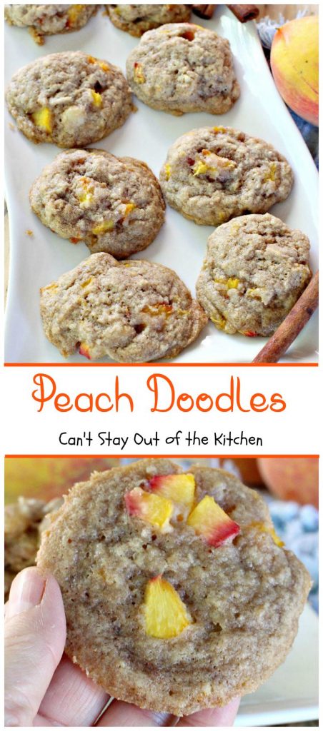 Peach Doodles are such a scrumptious treat. P-E-A-C-H D-O-O-D-L-E-S š Yes, siree, these delicious cookies are filled with fresh peaches, cinnamon and macadamia nuts, providing a lovely, nutty crunch that’s just wonderful. The flavors work so well together and I guarantee that after one batch, you’ll be making another really soon.