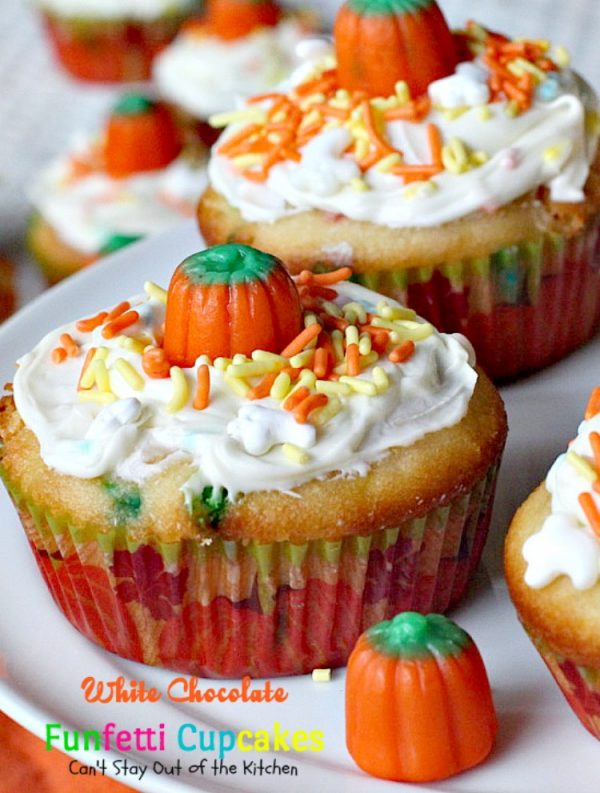 White Chocolate Funfetti Cupcakes are just awesome. No kidding. Funfetti cake mix, funfetti icing, funfetti sprinkles all topped off with white chocolate chips for a rich, amazing flavor that can’t be beat. White Chocolate Funfetti Cupcakes are a great go-to recipe when you need to throw a dessert together quickly. Plus, you can add candy decorations for the season–Easter, Halloween, Fourth of July, Christmas or St. Patrick’s Day to make them extra special.