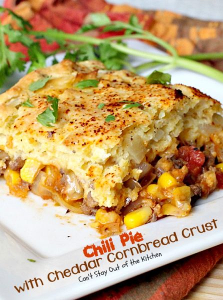 Chili Pie with Cheddar Cornbread Crust is a succulent and finger lickin’ recipe you’ll love! I love chili and cornbread and when you put it together in casserole form it’s even better! Plus, I went one better and made this one gluten free. This main dish consists of seasoned ground beef, cannellini beans, corn, diced tomatoes and green chilies covered with cheddar cheese and then a homemade green chilies and cheese cornbread spread on top. Serve with cilantro, sour cream, salsa, guacamole and extra cheese, if desired. All in all this is one fantastic meal!