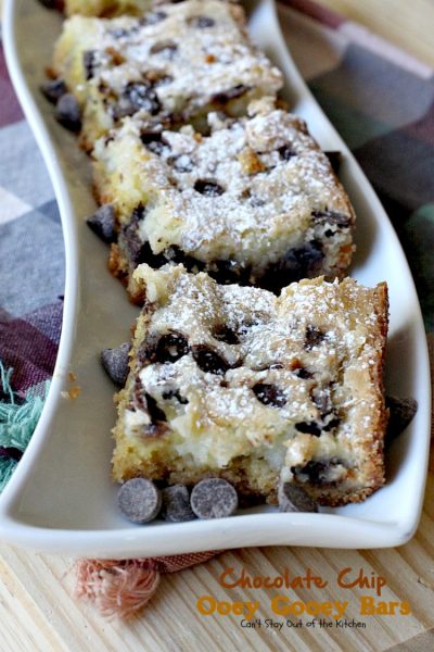 Chocolate Chip Ooey Gooey Bars are great for holiday parties.