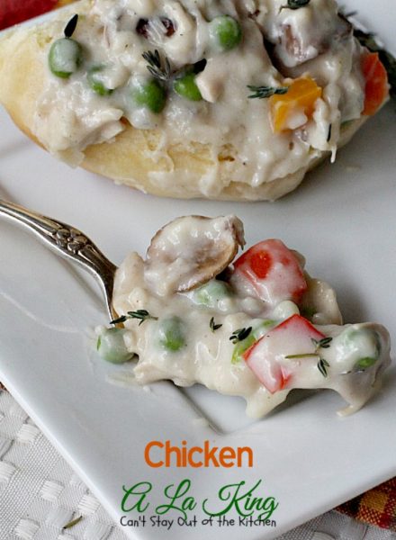 This amazing old-fashioned entree is wonderful served over [url href=”http://cantstayoutofthekitchen.com/2012/09/15/homemade-rolls-or-bread/” target=”_blank”]homemade rolls[/url], [url href=”http://cantstayoutofthekitchen.com/2015/11/04/flaky-buttermilk-biscuits/” target=”_blank”]biscuits[/url], toast or noodles. Chicken A La King is quick, easy and delicious!