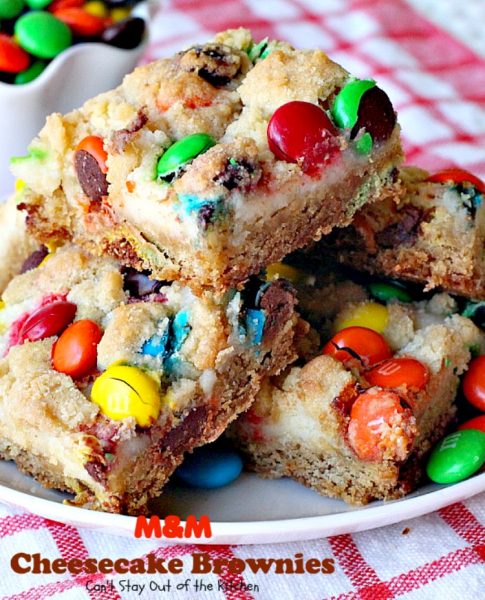 Okay, are you ready for a divine and decadent brownie? M&M Cheesecake Brownies have it all! They have a scrumptious M&M cookie crust that’s topped with a cheesecake layer, then more cookie dough is crumbled over top, followed by M&Ms sprinkled over all. These brownies are the real deal.