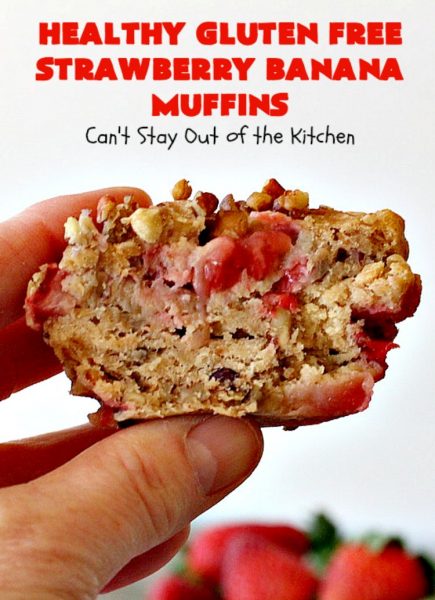 Healthy Gluten Free Strawberry Banana Muffins are simply awesome! They combine the best of healthy with the best of flavor and texture! They’re filled with a ton of strawberries, bananas and pecans. Every bite is amazing.
