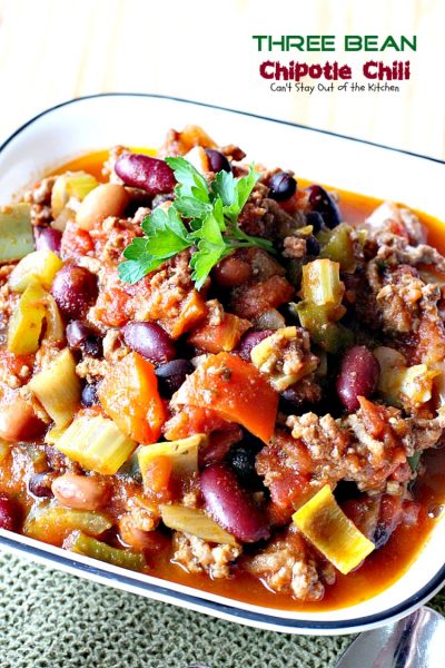 This lovely Three Bean Chipotle Chili started out as my attempt to copycat a recipe from a friend’s chili concoction that she through together on the spur of the moment. She told me the basic ingredients, I improvised adding a few additional ingredients and then at the last moment I remembered I had some chipotle peppers in the refrigerator that needed to be used up.