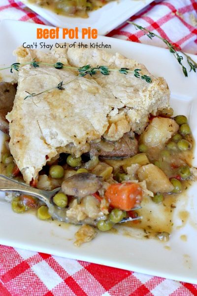 Every forkful will have you drooling. We had some friends stop by and have some of this delicious Beef Pot Pie with us. Their son was going to be spending the night with us since they were going out of town. They all tucked into this dish and wanted more! I think their teenage son enjoyed it the most!