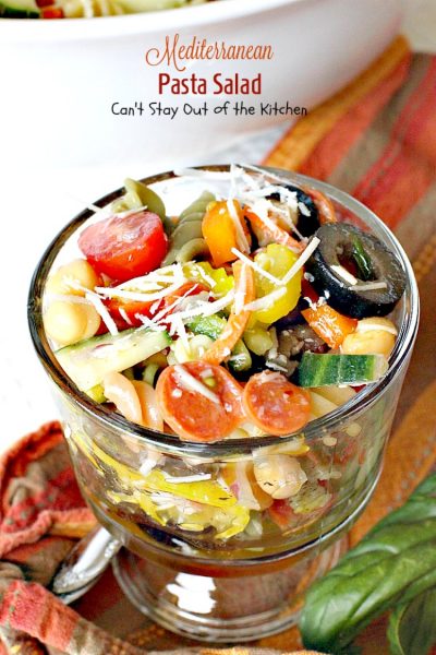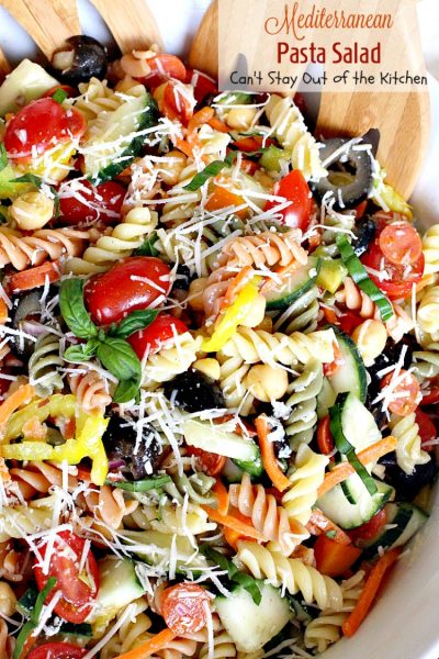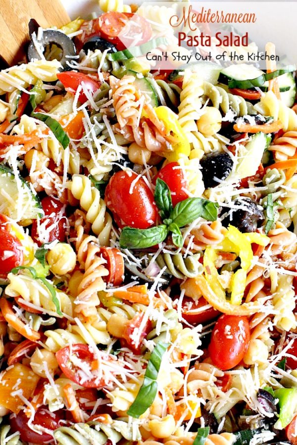 If you enjoy pasta salads you need to put Mediterranean Pasta Salad on your “to make” list. It’s really a great recipe to pull out when you have a lot of company and can be served with almost any kind of main dish like Grilled Chicken or even hamburgers!