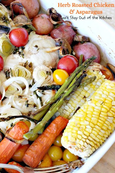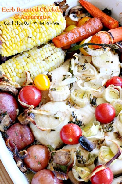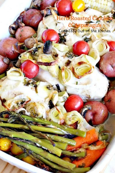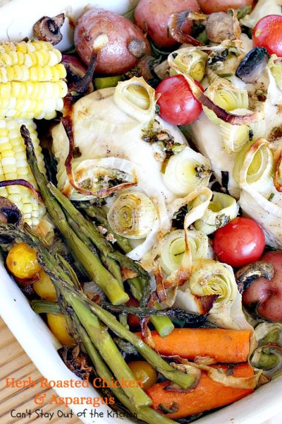 Herb Roasted Chicken and Asparagus is one of those lovely one-dish suppers that I love to make. Making everything in one casserole is so easy. You toss in the ingredients, sometimes pour a sauce or vinaigrette over top, and then bake. Simple, easy, quick.
