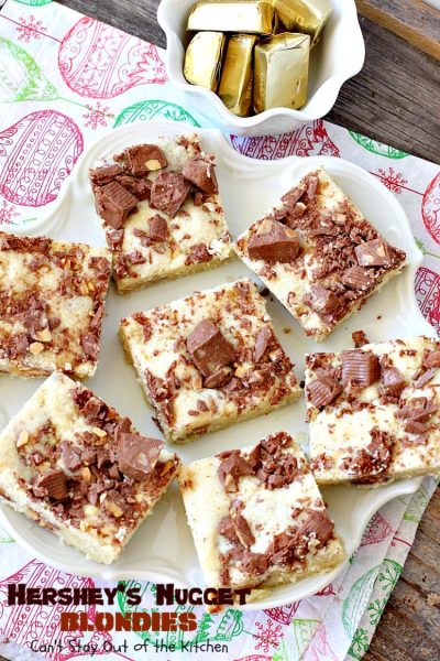 Hershey’s Nugget Blondies are great cookies to bake for Christmas cookie exchanges.