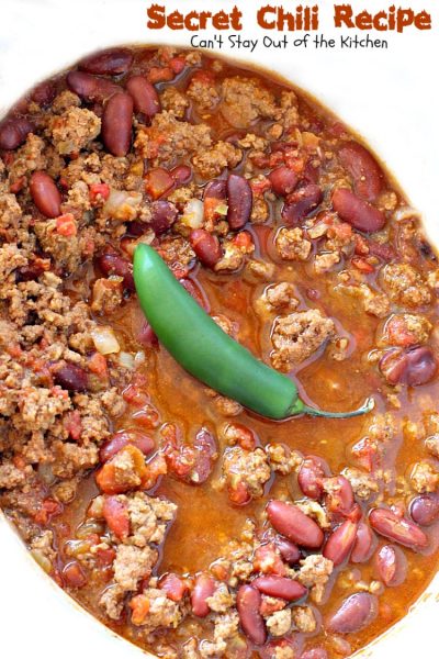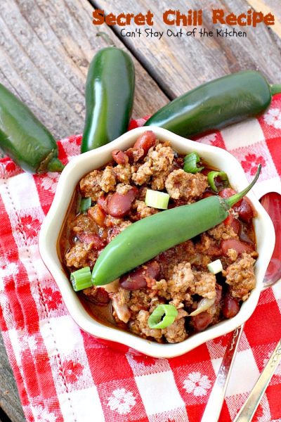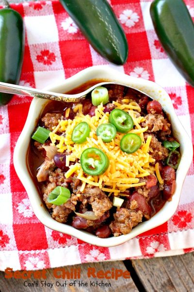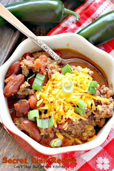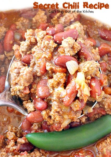 Unseeded serrano and jalapeno peppers give this scrumptious Secret Chili Recipe a nice kick without being too much.