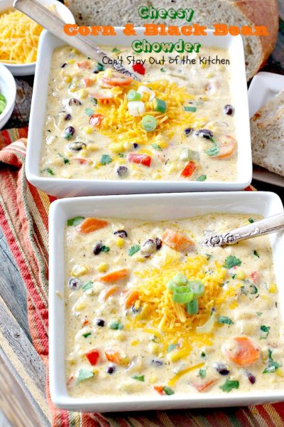 If you want a fabulous chowder for your next family meal, or to serve for company, Cheesy Corn and Black Bean Chowder should be on your menu. It’s seasoned well but not overly spicy by any means. I’m serious when I say you’ll be salivate over every bite!