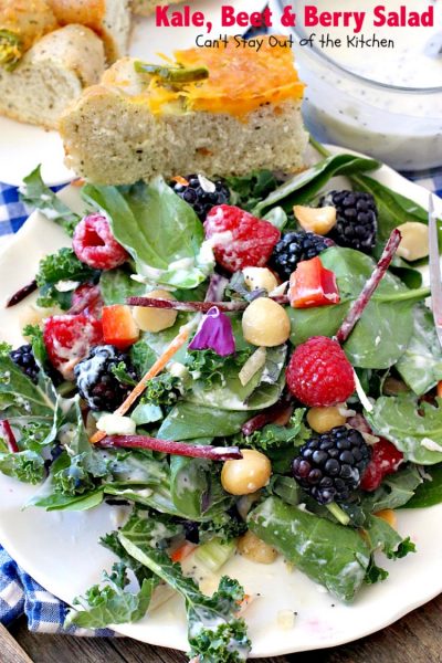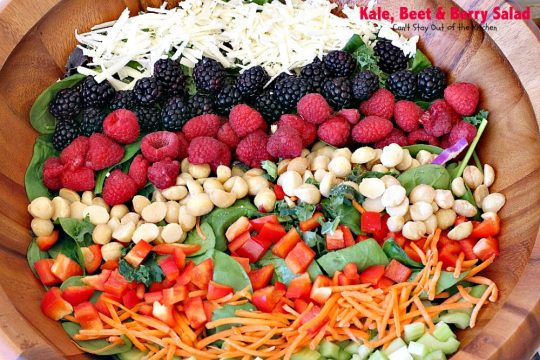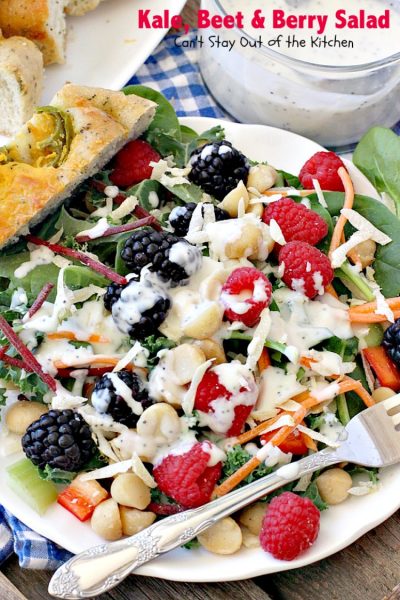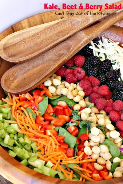 Kale, Beet and Berry Salad | Can't Stay Out of the Kitchen | This amazing #salad will knock your socks off! Seriously. It features #raspberries, #blackberries, #MacadamiaNuts & #asiago or #romano #cheese. Great for company dinners. #GlutenFree #beets #kale #healthy #LowCalorie #CleanEating