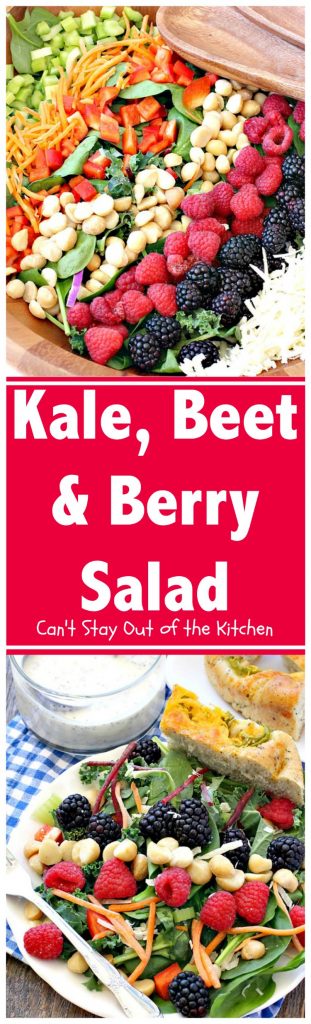 I would never have believed that Kale, Beet and Berry Salad could be so awesome! Seriously? kale?? beets?? Yikes. Well, they work really well in this delicious salad. I added baby spinach leaves to tone down the kale and blackberries and raspberries to tone down the beets. The salad gets crunch from macadamia nuts, celery, carrots and bell peppers.