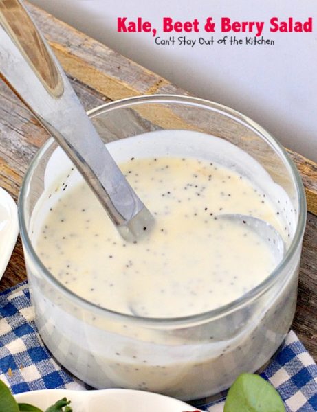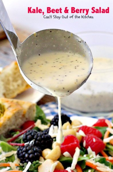 I loved the combination of flavors in Kale, Beet and Berry Salad. I found a kale & beet salad mix at Walmart and decided I just had to give it a try. The fruit, nuts and cheese take this salad to another level. While my poppyseed dressing has a strong lemony flavor, regular poppyseed dressing works just as well. I also have orange, cranberry-raspberry and apple cider dressings that would be lovely on this salad. For that matter, a citrus vinaigrette would go be rather exquisite, I think.