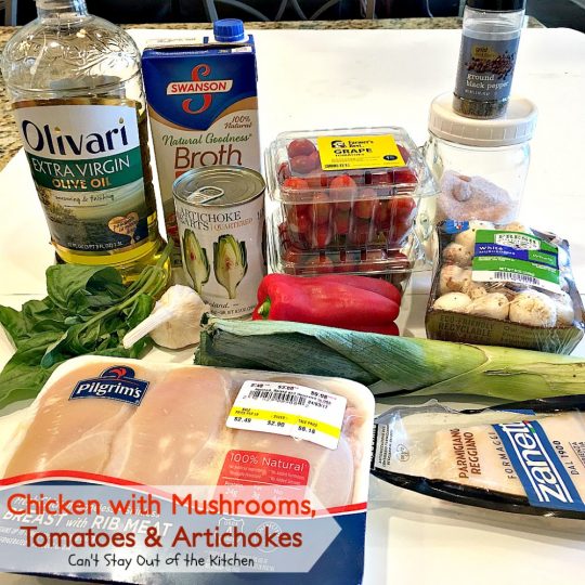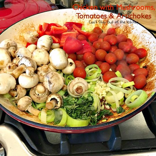 Every now and then you hit pay dirt with a new recipe. Chicken with Mushrooms, Tomatoes and Artichokes was one of those recipes. This lovely chicken dish includes mushrooms, tomatoes and artichokes in a lovely chicken broth with fresh basil, leeks and garlic and then it’s garnished with parmesan cheese. It’s a fabulous one-dish skillet dinner that is sure to be a crowd pleaser for your family. Plus, this entree is cooked in about 30 minutes making it quick and easy as well as delicious.