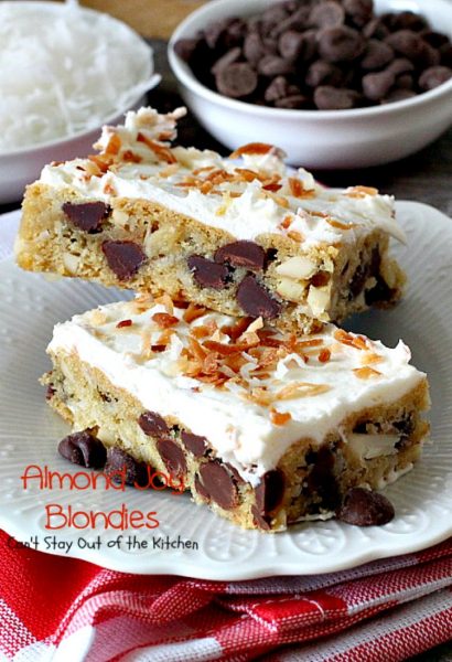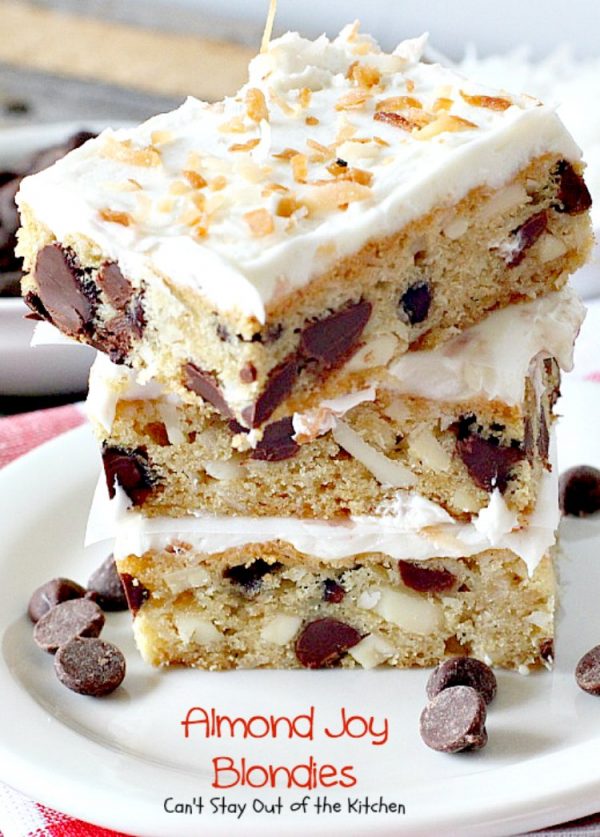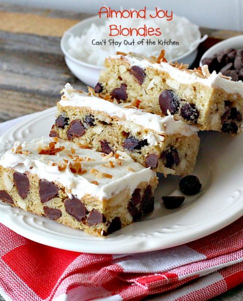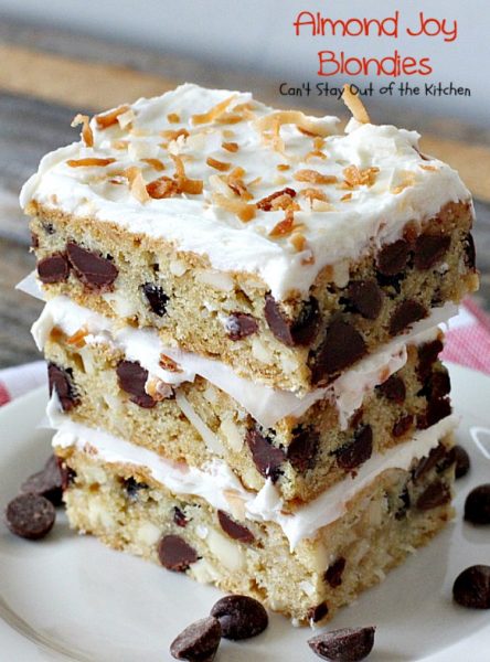 Death by Chocolate – that’s what Almond Joy Blondies are! Prepare yourself for one of the richest desserts ever! Mouthwatering, tempting, decadent, tantalizing and utterly delectable. These blondies are filled with double the chocolate chips, coconut and slivered almonds. Then they’re topped with a light, creamy buttercream frosting and sprinkled with toasted coconut. Say, “Yes!”
