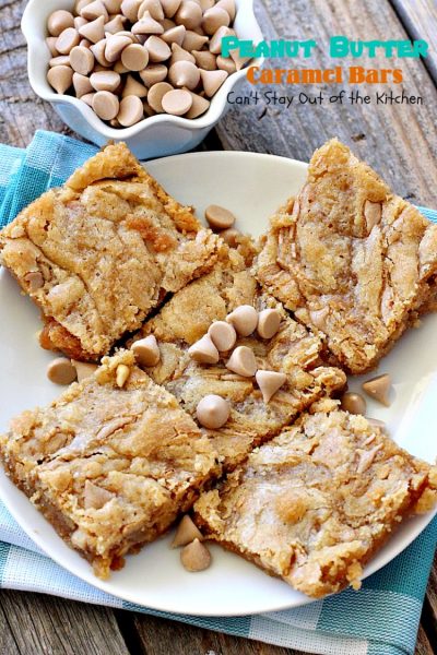 I love this Peanut Butter Caramel Bars recipe. I’ve made the basic recipe hundreds of times over the years. But I also enjoy putting a different spin on it occasionally. It’s terrific with white chocolate chips and Heath English Toffee bits. It’s also excellent using Nutella instead of the regular chocolate chips. This time I used sea salt caramel chips and it turned out just as decadent as all those other recipes.