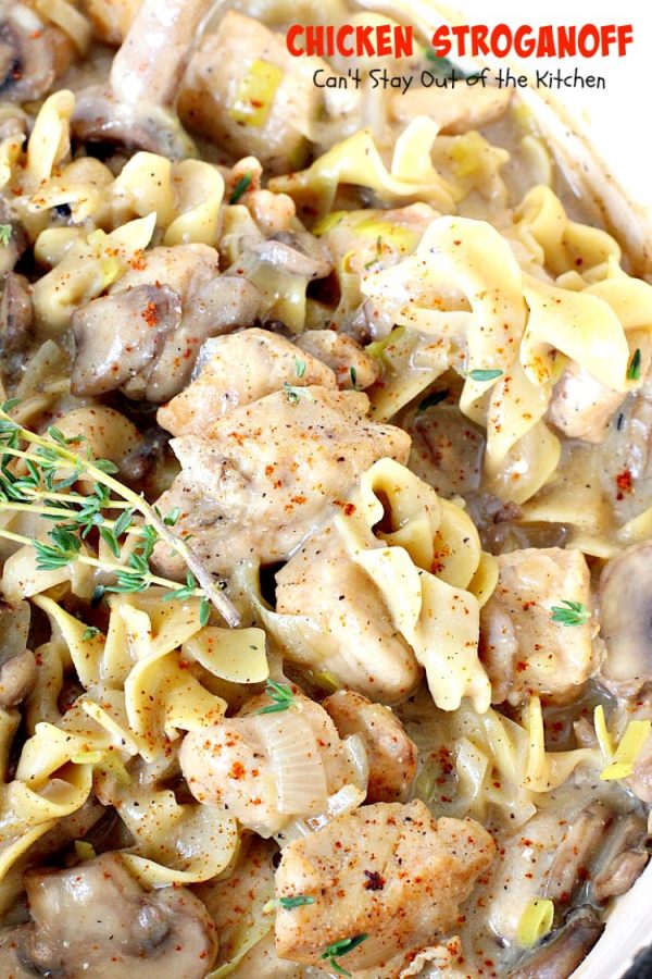 This recipe includes the traditional mushrooms, onions and garlic in a savory chicken broth and sour cream sauce. But it also includes leeks and additional seasonings to spice it up like paprika, cayenne pepper and Worcestershire sauce along with a little fresh thyme. I L-O-V-E-D Chicken Stroganoff. While I’ve made my Crockpot Beef Stroganoff a lot of times over the years and even meatball and hamburger versions, I’ve never made stroganoff with chicken before. This entree was absolutely sumptuous.