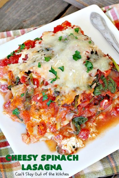 Cheesy Spinach Lasagna is a fabulous meatless pasta dish. Instead of meat, the tomato sauce includes fresh spinach, and the filling includes a ricotta cheese layer as well as parmesan and mozzarella cheeses. It’s super delicious and perfect for family or company dinners.