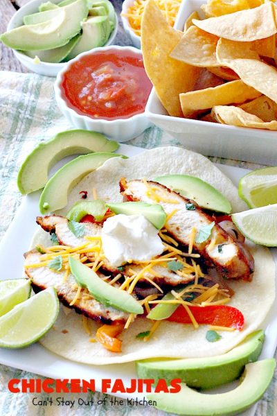 Chicken Fajitas are wonderful served with avocados, lime, cheddar cheese, sour cream, cilantro and salsa.