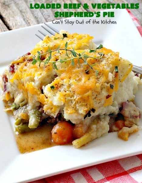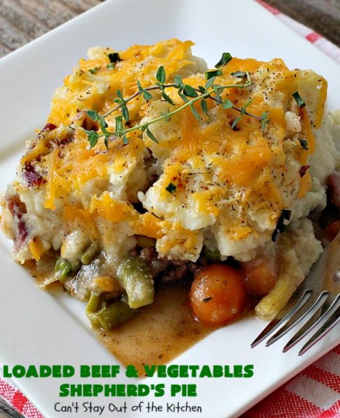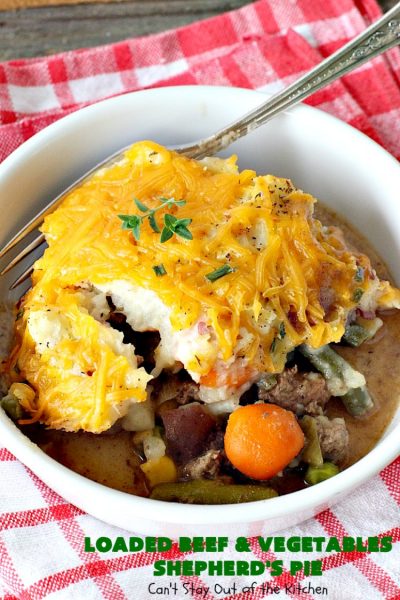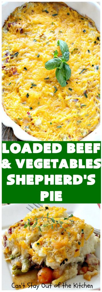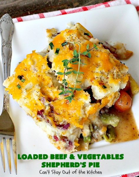 If you’re looking for a terrific Shepherd’s Pie recipe, I highly recommend this Loaded Beef and Vegetables Shepherd’s Pie. Every morsel is mouthwatering. Even people who don’t usually like casseroles found themselves going back for multiple servings, the night I made it. Yes, it was THAT good! 🙂