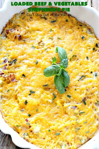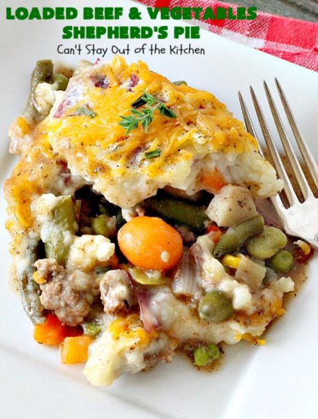 Our company raved over Loaded Beef and Vegetables Shepherd’s Pie. They cleaned out both casseroles and everyone came back for a second serving! I served this delicious casserole with Buttermilk Cucumber Tomato Salad. Both were terrific.
