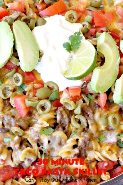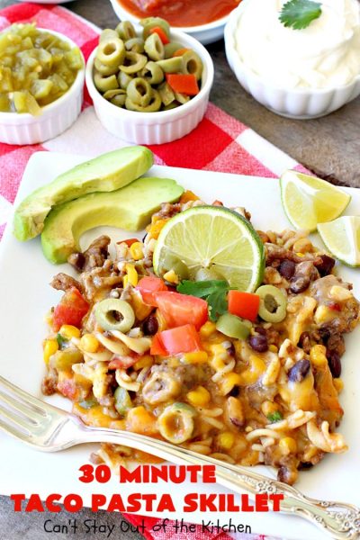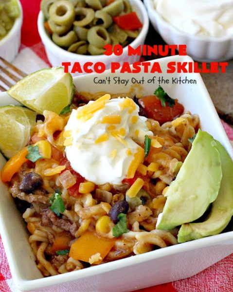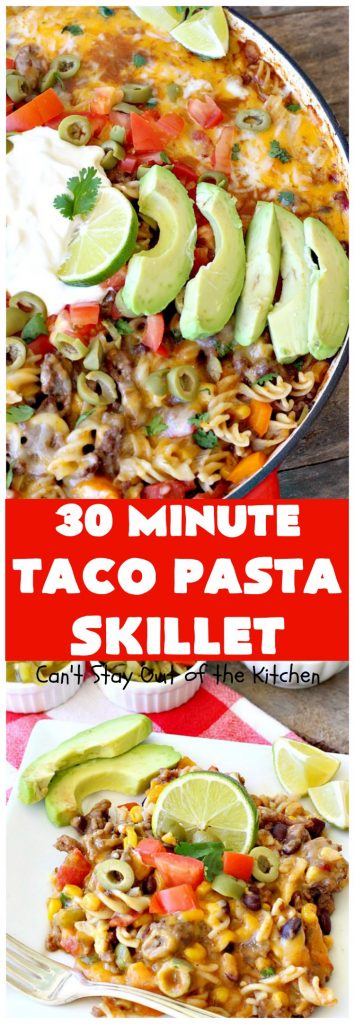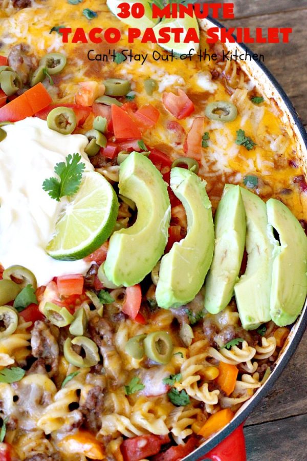 Taco Pasta Skillet is a 30-minute one-pot meal that’s a delightful Tex-Mex entree. I used lean ground beef, diced tomatoes, green chilies, black beans, Fiesta corn, Mexican cheese blend, gluten free rotini and my Homemade Taco Seasoning. I topped the skillet with sour cream, olives, tomatoes, fresh cilantro, cheese and avocados. However, adding guacamole, pico de gallo or salsa are also great options.