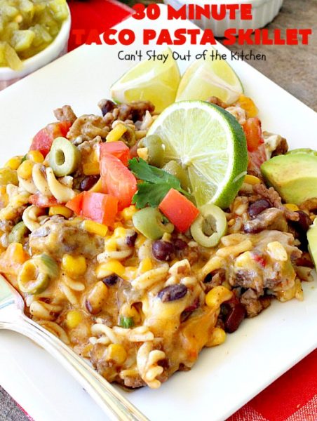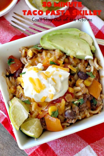 The next time you need to throw together a 30-minute meal, I highly recommend this Taco Pasta Skillet. If you enjoy a little spice in your life, you’ll find this tasty dish memorable and delectable. 🙂
