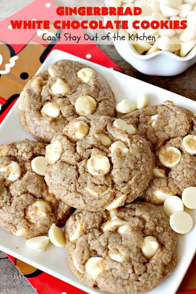 Gingerbread White Chocolate Cookies are a dynamite, yet a super easy cookie recipe for Christmas cookie exchanges and holiday parties. If you just want to celebrate this time of year with a special treat, these cookies are a must! Eat two or three of them for me while you’re at it. 🙂