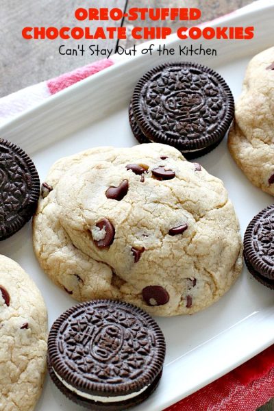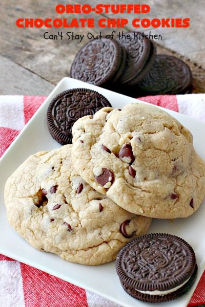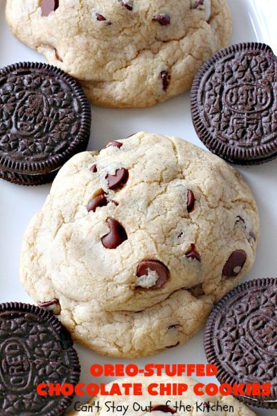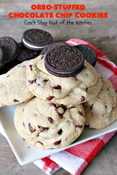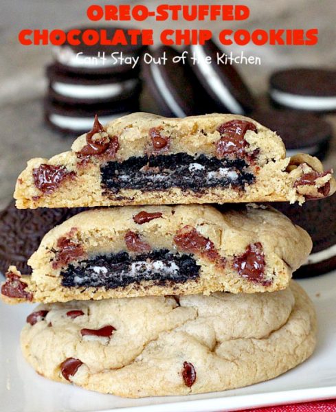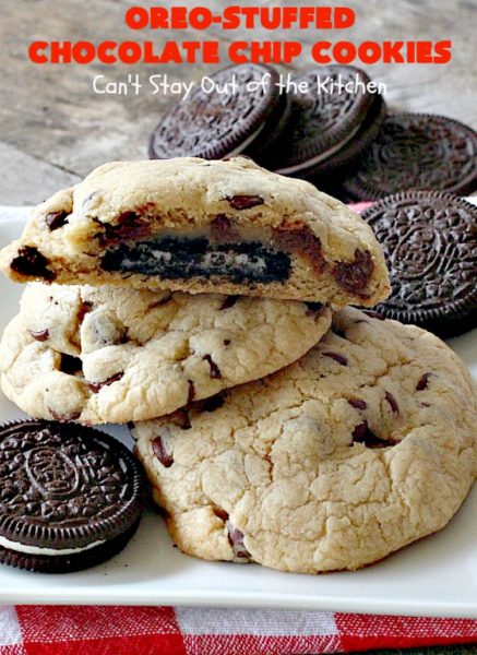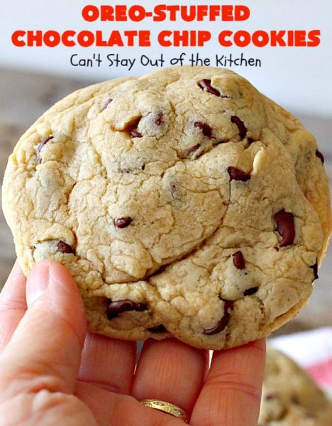 Oreo-Stuffed Chocolate Chip Cookies are beyond amazing. These cookies are monster-sized whoppers! š I mean these amazing goodies absolutely rock. A luscious chocolate chip cookie dough is wrapped around an Oreo cookie. Oh my. They are H-U-G-E and so sensational. Seriously, they are soooo big it’s like eating a whole meal. Prepare yourself for a chocolate sugar high like you’ve never experienced before!