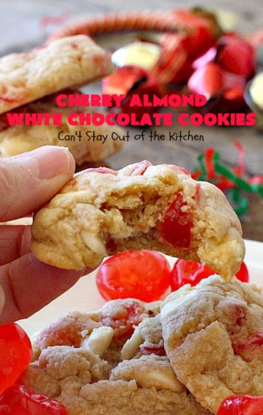 I love cherries, and these scrumptious Cherry Almond White Chocolate Cookies are terrific. I start with my favorite Mrs. Field’s copycat chocolate chip cookie dough. Instead of regular chocolate chips I substitute REAL white chocolate chips, add candied cherries and slivered almonds. Yes, they are absolutely wonderful.