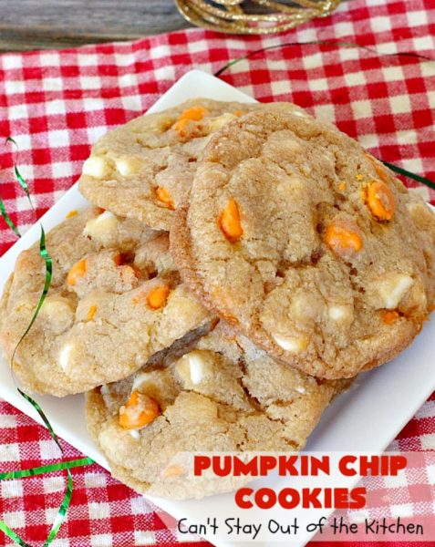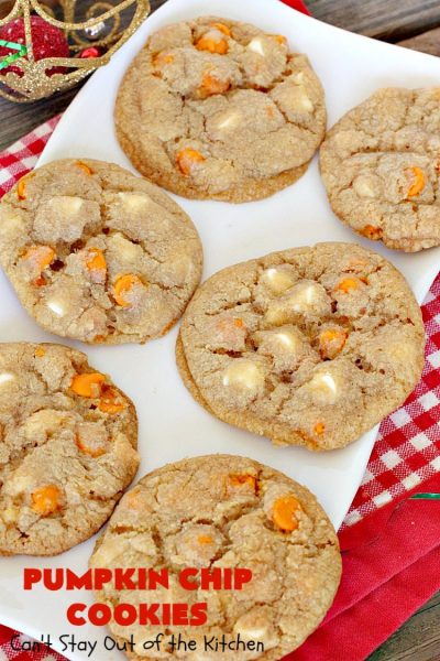 You can’t find pumpkin ‘n spice chips any other time of the year except fall/Christmas time frame (unless perhaps you can get them on Amazon). But these scrumptious cookies are ones you really need to include in fall and/or holiday baking when you get the chance.