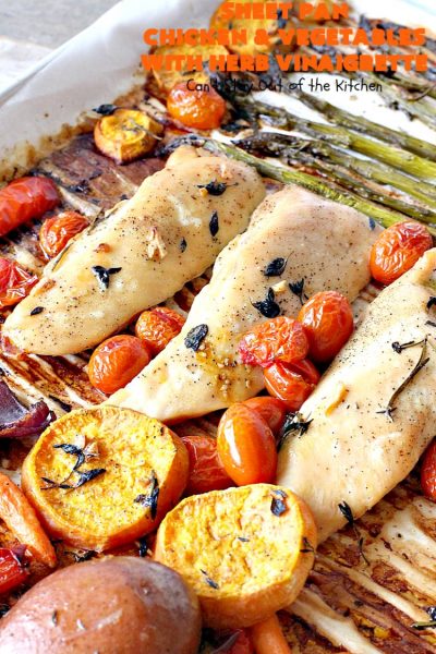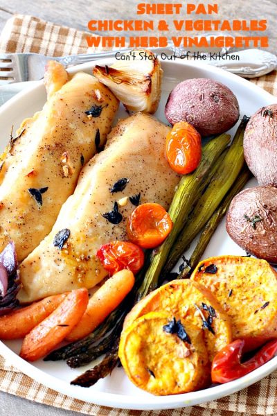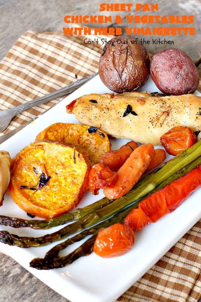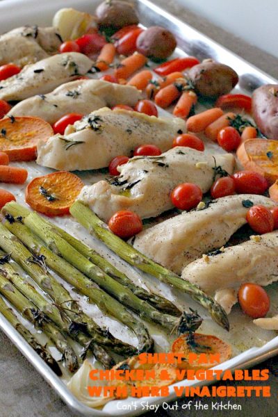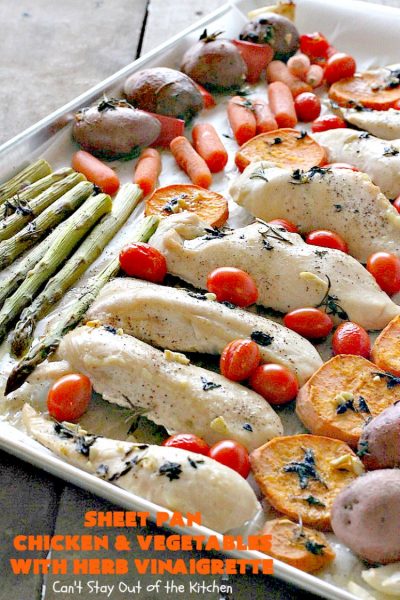 Sheet Pan Chicken and Vegetables with Herb Vinaigrette is absolutely mouthwatering. On top of that, this one-pan meal is really, really easy. E-A-S-Y! Basically, you layer chicken breasts on a sheet pan. Add whole red potatoes, baby carrots, sweet potato slices, asparagus and red onion pieces. Then a tasty Herb Vinaigrette is drizzled over the meat and veggies before baking. Grape tomatoes are added the last 30 minutes of baking time. This easy and sumptuous dinner is just wonderful.
